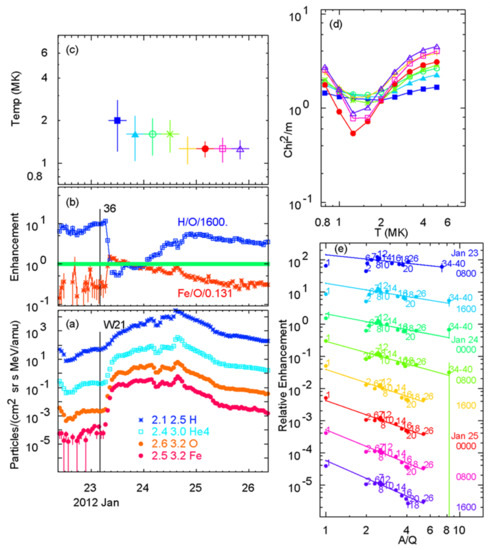 (a) Intensities of H, He, O, and Fe vs. time. (b) Normalized abundance enhancements H/O and Fe/O vs. time. (c) Best-fit temperatures vs. time for the 23 January 2012 SEP event. (d) χ2/m vs. T for each 8 h interval. (e) Enhancements, labeled by Z, v vs. A/Q for each 8 h interval shifted ×0.1, with best-fit power law for elements with Z ≥ 6 extrapolated down to H at A/Q = 1. Colors correspond for the eight intervals in (c–e) and symbols in (c,d); times are also listed in (e). Event onset is flagged with solar longitude in (a) and the event number from the list of 45 events [113] in (b) [112].