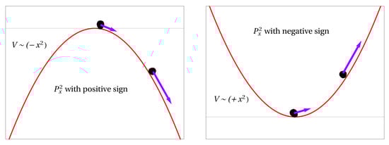 Equations (22) describe an uncoupled system comprising a harmonic oscillator and an inverted one. In Figure 1 we illustrate the fact that having regular harmonic potential with a negative (indefinite) kinetic term is equivalent, in the quantum point of view, to the situation where an inverted oscillator potential has a positive kinetic term. In both situations we have to deal with an unstable system, which would correspond of having variable x varying uncontrollably. A wave function that initially has a Gaussian profile, will evolve over time according to,