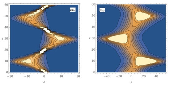 by redefining . The wave function obtained from the computation of Equation (23) shows a progressive squeezing of the state in phase space, which means an increasing uncertainty in the value of x. Physically, in this simplified model, that would correspond to an unstable variation of the Schwarzschild radius or mass of the black hole. Even though, conceivably, a strong squeezing of the black hole state would occur [39], driving its disappearance.