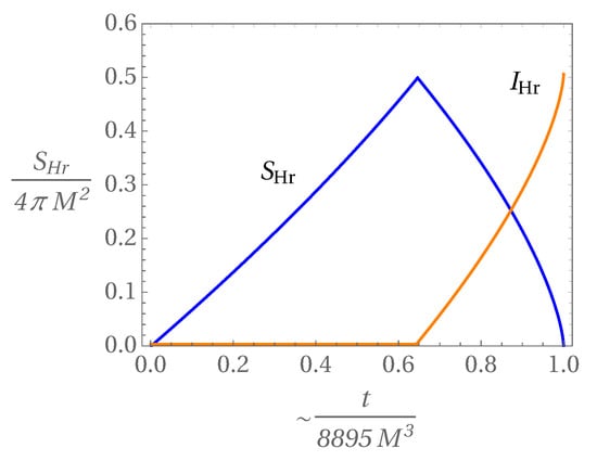 Therefore, the given subsystem will be near its maximum entropy whenever . Afterwards, he applied this new conjecture to the case of the black hole evaporation process [44]. Assuming that initially Hawking radiation and black hole are in a pure quantum state, described by the density matrix , he showed that the Von Neumann entropies related to the reduced density matrices (radiation - Hr - and black hole - Bh-),