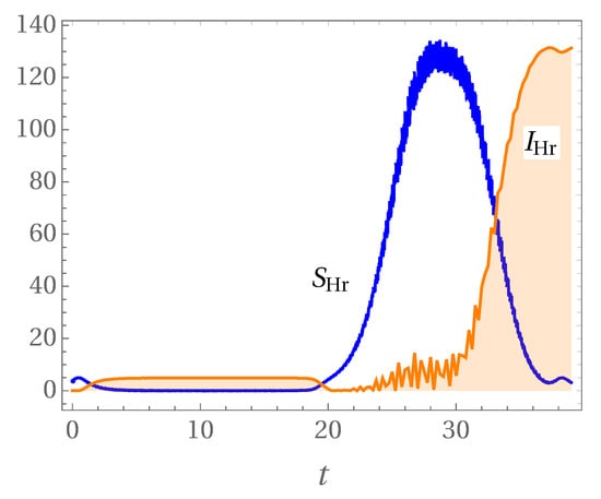 with . We can check that for . In the numerical simulations, to calculate the relevant physical quantities, we will assume that and such that the potentials, in Equation (26), are of the same order, i.e., . This corresponds to assume that the Hawking radiation energy is well below Planck scale and, the fluctuations of the Schwarzschild radius have significantly smaller frequency than the Hawking radiation energy fluctuations. The numerical factor choice of is arbitrary and does not influence the conclusions to be drawn from the results presented in subsequent sections. However, we can establish that the coupling is defined in the interval