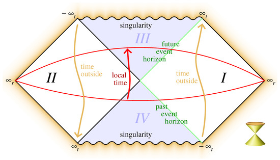 - Kruskal, M.D. Maximal extension of Schwarzschild metric. Phys. Rev. 1960, 119, 1743. [Google Scholar] [CrossRef]