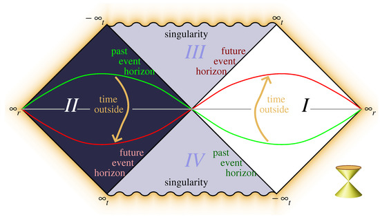 In Figure 1, the classically accessible domain is indicated as the diamond shaped region I. The upward arrow labelled as “time outside” is the arrow of the Schwarzschild time coordinate t (or ). The radial Schwarzschild coordinate r (or ) is oriented in the horizontal direction.