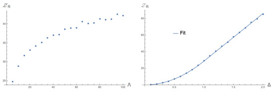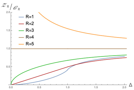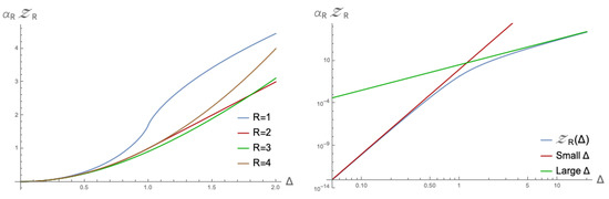 This motivates us to look at a specific case of the quantity (26), namely for . As is clear from the structure of the function, appears to be a special value which we can analyse further. Fixing gives us the opportunity to look at the R and w-dependence a bit closer. Up until now, we have kept the value of w arbitrary; it is however interesting to see what happens for specific values of w. It turns out that, peculiarly, when taking
