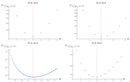 Contrary to the case above, one might expect (10) does not always converge. The matrix model analysed in [14,15,16], corresponding to a choice of parameters of and , did not converge in general. It had a critical value around , above which the limit did not appear to converge anymore. In the current section, we will add numerical analysis for general K and and discuss the apparent leading order behaviour. The main result of this section is that for , the critical value seems to be . Hereafter, in this section, we will always assume .