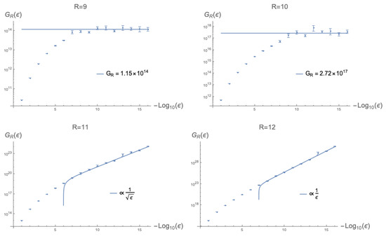 Upon inspecting Figure 3, it can be seen that (26) has some interesting R-dependence. Firstly, while the limiting behaviour for to 1 is already clear from (24) and the overlap in the regions as sketched in Figure 2, the quantity will limit to 1 from below for , while for , it will limit towards 1 from above. The reason for this is that for large R, even with small , there will be many tensor rank decompositions that approximate an arbitrary tensor with error allowance less than , while for small , the volume counted by will be small. This shows that for small , the regions in Figure 2 scale in different ways. Secondly, what is interesting is that the curve overtakes the curve around , and for larger R the behaviour for small changes from accelerating to decelerating.
