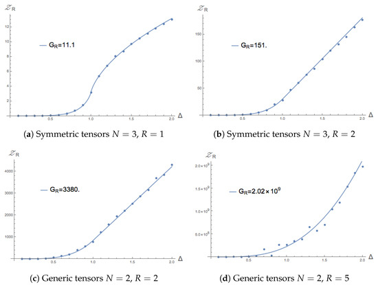 This concludes the proof of (22). As mentioned before, the derivation is exactly identical for generic tensors. The main difference now is that the number of degrees of freedom is different for this tensor space. What is left to determine are the range of R for which is finite and the value of . This will be carried out in Section 4.