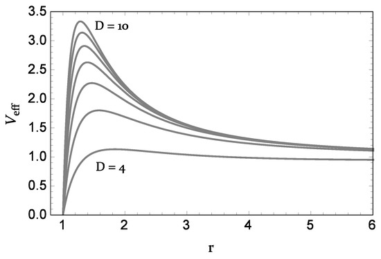 Radial profile of the effective potential of a photon in the Schwarzschild–Tangherlini spacetime for and the dimension in the range .