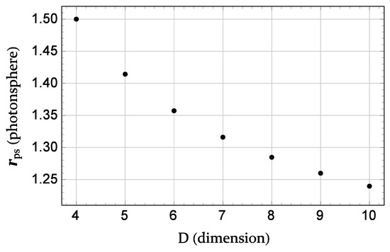 In Figure 2, the radius of the photonsphere for several dimensions of the spacetime is presented. In the case of a standard Schwarzschild black hole, one recovers the photonsphere at .
