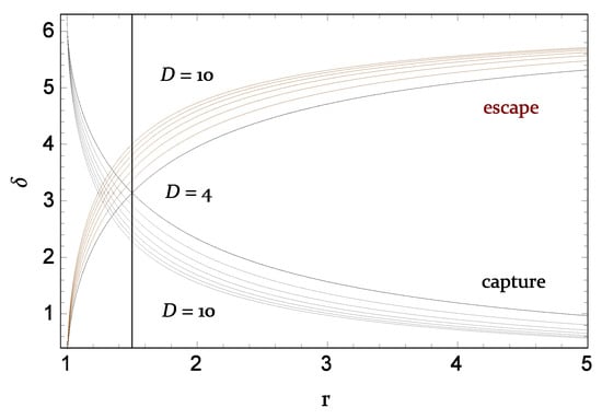 The zeros of a polynomial on the right-hand side of (32) represent the turning points. As in the case of the capture of photon in the previous section, from a shape of the effective potential in Figure 1 it is easy to realize that depending on the energy of the particle, there can be up to two turning points and one of the three scenarios presented in the previous section can occur. Again, the critical impact parameter corresponds to the case with one turning point where two turning points merge. The two turning points merge only if the discriminant of the polynomial on the right-hand side of (32) vanishes. Again, to find the discriminant, we apply the Sylvester matrix for the resultant polynomial. In our case, the Sylvester matrix is the one with a size of . Unfortunately, we could not solve the determinant of this matrix for the arbitrary dimension. Therefore, we solve them by specifying the dimensions of the spacetime below.