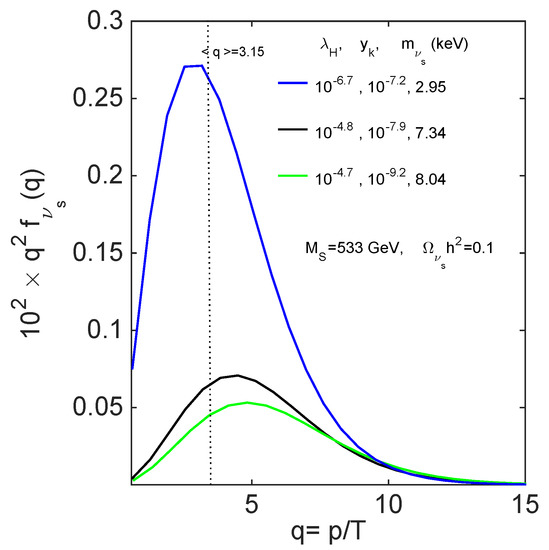 The dependence of the sterile neutrino momentum distributions on the co-moving momentum for the scalar mass = 533 GeV and different values of the Higgs coupling, , and Yukawa coupling, . The dotted line indicates the averaged co-moving momentum corresponding to sterile neutrino thermal distribution. Other parameters are fixed to: , , , = 70 km sMpc.