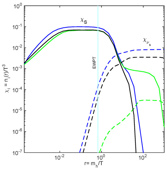 The dependence of the abundances of scalar (continuous lines) and sterile neutrino (dashed lines) on the time parameter for the same models presented in Figure 1. The vertical blue line indicates the temperature of the electroweak phase transition (EWPT).