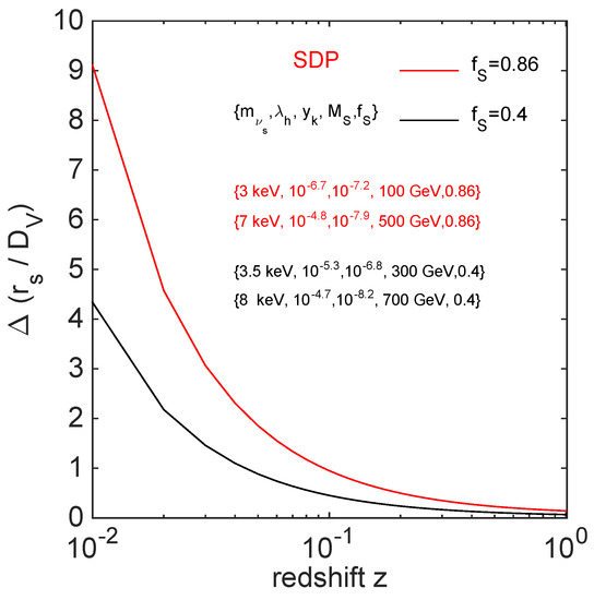Redshift dependence of the variation of BAO characteristic parameter, , for models sharing the same sterile neutrino mass fraction in the SDP scenario. The production mechanism parameters are indicated for each case. Other parameters are fixed to: , , , = 70 km sMpc.