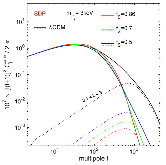 The dependence of the deflection angle power spectra on sterile neutrino mass fraction in models sharing the same sterile neutrino mass , obtained in the SDP scenario. For comparison, we plot the deflection angle power spectrum for the CDM model. The contributions of the wave-numbers in the range Mpc are also indicated (dotted lines). Other parameters are fixed to: , , , = 70 km sMpc.