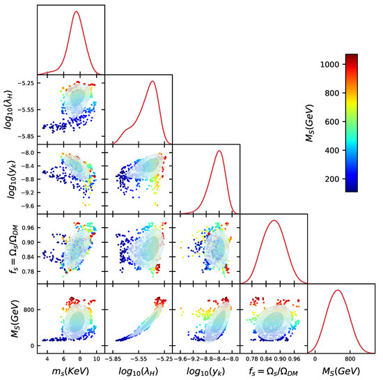 The marginalized likelihood probability distributions and the joint confidence regions (68% and 95% CL) for SDP mechanism parameters color-coded by the scalar mass values . The dominant effect on SDP mechanism is given by the strength of the Higgs coupling, , that sets , and the strength of Yukawa coupling, , that sets . The best fit values of the SDP parameters lead to = 0.86 ± 0.07 (68% C.L.), indicating that SDP is a dominant mechanism.