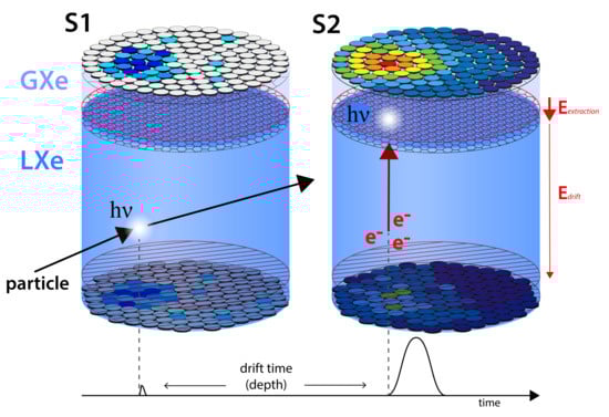 The successful technology used by the XENON project to search for DM is based on dual-phase time projection chambers containing LXe with a small gap of gaseous Xenon (GXe) above it. A sketch of a dual-phase TPC and the signal production is shown in Figure 1. The cylindrical TPC is read by two arrays of light sensors, usually photomultiplier tubes (PMTs): one at the bottom immersed in LXe and one at the top facing the GXe region. The LXe sensitive volume is enclosed between two electrodes that establish an electric drift field: the cathode, negatively biased, at the bottom and the gate, grounded, at the top, right below the GXe volume. The drift field is kept uniform by means of thin copper rings properly biased and distributed along the vertical axis. A particle interaction in LXe produces a prompt scintillation signal, called , which is detected by both PMT arrays (in a larger fraction at the bottom due to internal reflection of scintillation photons at the liquid–gas interface). The ionization electrons that do not recombine are drifted towards the gaseous region at the top, where they are extracted by a strong electric field ((10 kV/cm)) applied by an anode electrode placed close to the gate, above the liquid–gas interface. Ionization electrons moving under a high electric field can acquire enough energy to excite atoms in GXe and produce light via proportional scintillation (electroluminescence) [59]. The related signal, called , is recorded by both PMT arrays. The signal is delayed with respect to by the electron drift time from the interaction site to the liquid–gas interface.