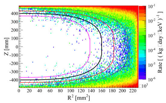 Simulation of background events originating from detector’s materials radioactivity in XENON1T. The spatial distribution inside the active volume of the TPC is shown as a 2D histogram. The contours indicate progressively smaller super-ellipsoid inner fiducial volumes where the total background rate is largely suppressed with respect to the outermost layers of the TPC. The highly-efficient self-shielding extends also to external neutron sources. Image from Ref. [60].
