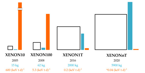 The detectors of the XENON dark matter search program. The dimensions of the cylindrical TPCs (diameter and height) are compared by the empty boxes with black contour (the relative scale and shape differences among the detectors are faithfully preserved): cm (XENON10), cm (XENON100), cm (XENON1T), cm (XENONnT). The year of construction is reported in black. The cyan bars and text show the active LXe mass (contained inside the TPC). The total amount of LXe used inside the cryostat is: 25 kg (XENON10), 161 kg (XENON100), 3200 kg (XENON1T), 8000 kg (XENONnT). In orange, the level of low-energy ER background (≲20 keV) is shown. The XENONnT rate (marked with *) is the experiment’s goal according to the expected performance and purity.
