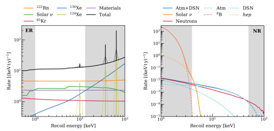 A key feature of Xe-based dual-phase TPCs is the highly efficient discrimination of nuclear recoils (NRs) from electronic recoils (ERs). The former are induced by WIMP scatters (and neutrons as well), while ERs include and interactions originated from radioactive backgrounds. The electron–ion recombination process determines the ratio between and signal, as it subtracts electrons to the charge signal and enhances the scintillation light production. The extent of recombination depends on the particle type as tracks with high density of free charges lead to larger recombination rates. Highly ionizing particles like deposit most of their energy in a dense electron–ion pairs core with a fraction of collected charges , while almost all charges are collected for electron and interactions (ERs). NRs produce dense tracks due to the high atomic number of the recoiling Xe nuclei, thus leading to a much larger recombination fraction than ERs. Therefore, the ratio of NRs is much smaller compared to ERs. As an example, the separation between the ER and NR populations is illustrated in Figure 3.