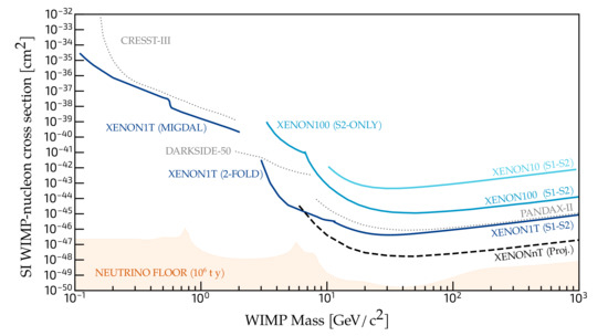 - Aprile, E. et al. [The XENON Collaboration] Projected WIMP sensitivity of the XENONnT dark matter experiment. J. Cosmol. Astropart. Phys. 2020, 11, 31. [Google Scholar] [CrossRef]