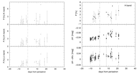 Figure 1 shows the linear polarization in the bands, taken with IRSF/SIRPOL around the 2010 periastron. The polarization degree in the near-infrared bands did not change significantly around the periastron, although it may have increased by <1% in the J and H bands at the time of brightening. Please note that the polarization degree observed 198 and 301 days before periastron was the same as that at periastron, within the error margins observed. The average polarization degree in the J, H, and bands were %, % and %, respectively. Johnston et al. (1996) have reported that the linear polarization degree in the radio bands was very high (several tens of %), but depolarization was observed around the periastron, when the pulsar was thought to be behind the Be disk [].