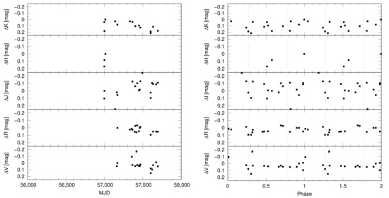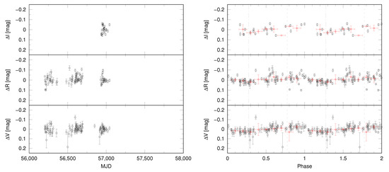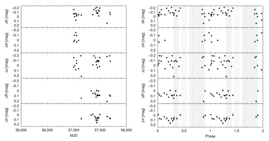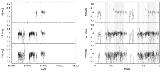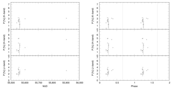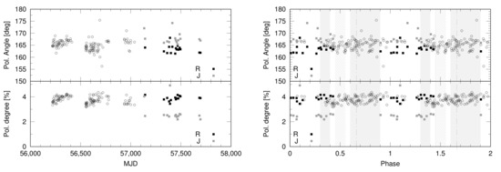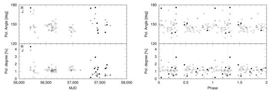 Figure 4 shows the polarimetric variation in the R and J bands. The polarization degree (∼1%) is very small, comparable to the order of the error of the instruments. No orbital modulation was suggested. Periodic variability has been reported to have a period of 13.244 days—half of the orbital period []. The average polarization degree and angle were % and degree in the R band, and % and degree in the J band. The result for the R band was consistent with that of previous studies; % and degree [].