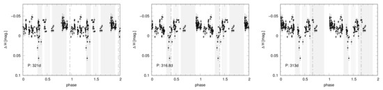 H-band relative magnitude of HESS J0632+057 by IRSF/SIRUIS folded with three different orbital periods: 321 days [] (left), 316.8 days [] (middle) and 313 days [] (right). The phases of the X-ray outbursts ( ∼ 0.3–0.4 and ∼0.6–0.9) are marked with the light-gray shaded area, and that of the dip ( ∼ 0.45–0.55) with the striped area. The vertical dash-dotted line in each figure indicates the periastron phase offered by the same reference of the folding period.