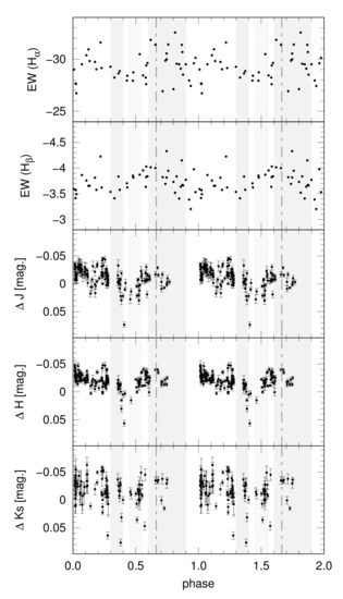 Relative magnitude in the near-infrared band of HESS J0632+057 (IRSF/SIRUIS), compared with EW of H and H [,]. From the top to bottom, EW(H), EW(H), J, H, and magnitude are plotted. The orbital period (313 days) to fold the data, and the phase at periastron () are cited from Moritani et al. []. See Figure 5 for the description of the gray and striped area.
