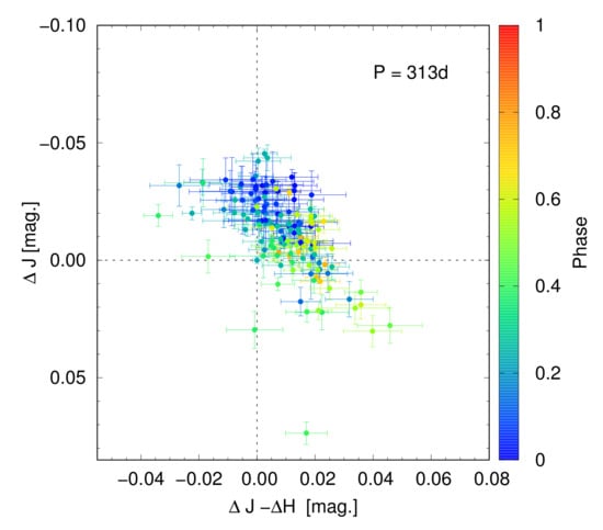 Figure 6 shows the J-, H-, and -band photometry data, compared with the Equivalent Width (EW) of H and H lines. A decrease of magnitude is also seen in the J-band. The EW of H did not show a clear orbital modulation. The absolute value of EW of H, on the other hand, showed a hint of modulation with two minima in one orbital cycle; ∼ 0.3 and ∼ 0.9. The phase at its minimum is different from those of the J and H flux ( ∼ 0.3–0.4). Figure 7 compares the color change () with respect to the variation in the J band (). The color–magnitude diagram suggests that when the flux decreases at ∼ 0.3–0.4, the system becomes redder. In contrast to PSR B1259−63 [], it seems that no color transition was observed while the magnitude was increasing and decreasing.