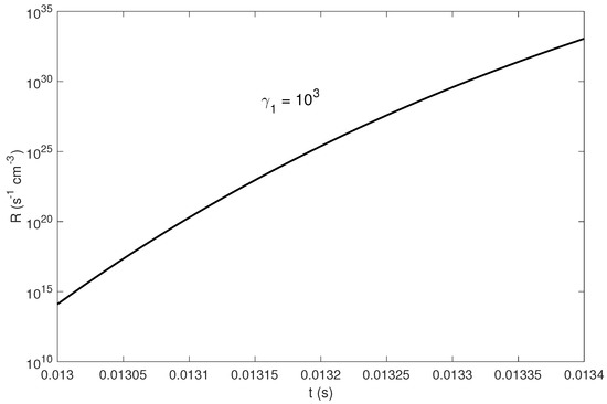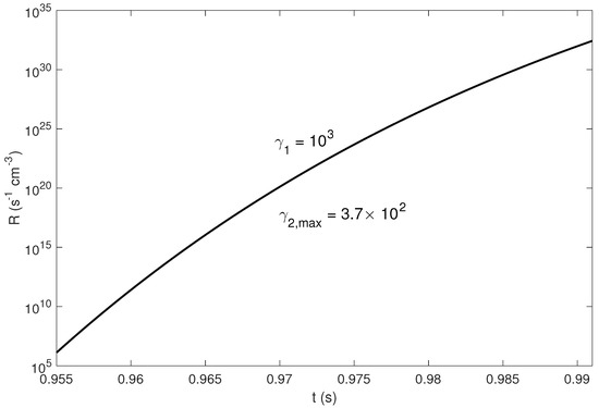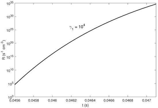 By taking these values into account one can estimate the pair production rate from Equation (15). On Figure 2 we plot the dependence of R versus time. The set of parameters is the same as in Figure 1 except . As is clear from the plots, the pair creation rate is a continuously increasing function of time, which is a natural result of the fact that, by means of the parametric instability, the electrostatic field exponentially amplifies (see Equation (11)). From the plots it is also evident that only at time scales very close to the termination time scale the pair creation becomes extremely efficient; therefore, only those cases are physically interesting where is not more than P. One can straightforwardly check that for the maximum value of when the mentioned condition is satisfied equals 370 and for the critical relativistic factor equals 865. The similar dependence as in Figure 2 but for the critical value of corresponding to is shown in Figure 3 and, as is clear, the termination occurs for the escape time scale. For higher values of the termination time will be larger and therefore the process will not be efficient. The results for are not distinguished significantly from the ones shown in Figure 3 and therefore we do not show them.