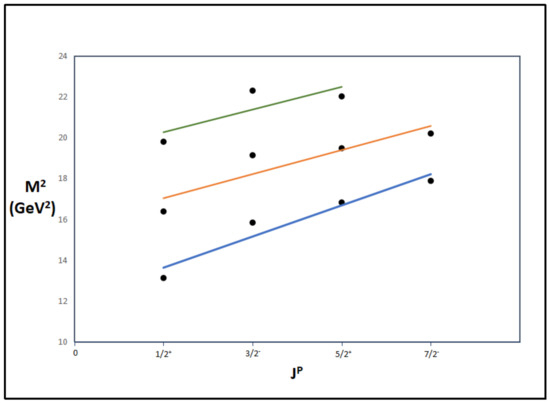 The Regge trajectory is useful to determine the unknown quantum numbers from the slopes () and intercepts () [12,13,41,42,43,44]: