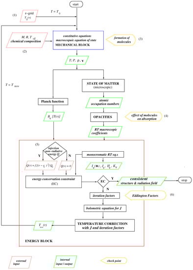 According to the nature of their mutual interactions, we group the individual physical processes into elementary blocks, such that each of them contains the statement of a self-consistent physical problem that cannot be further reduced. We then organize the above building blocks sequentially into a mechanical macro-block and an energy macro-block, coupled through a block that accounts for the microscopic state of matter. If an educated guess at one of the fundamentals variable—the distribution of the temperature with depth turns out to be the optimum choice for physical reasons—is introduced as an external input, the equations of the mechanical macro-block can be solved to yield the values of all the input variables required for the successive determination of the microscopic state of matter. Hence, the macroscopic transport coefficients that specify the radiative transfer (RT) equations can be computed. In the next step, within the energy macro-block, the latter are solved and the constraint of energy conservation can be checked. If the constraint is not fulfilled, the current values of the temperature must be up-to-dated using the energy conservation constraint as a transcendental equation for the temperature. The sequential solution of the RT equations followed by the temperature correction is iterated a pre-set number of times (inner iterations) keeping unaltered the transport coefficients that are the input of the energy block. Afterwards, the procedure is repeated from the beginning with the new temperature distribution, and iterated until the energy constraint is satisfied within a prescribed criterion of convergence (outer iterations).
