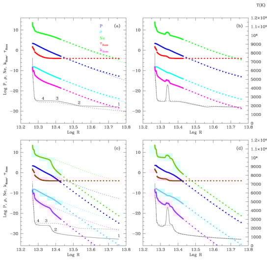 The dependence on the radial distance R of the temperature T (black), pressure P (blue), density (cyan), nr. of electrons per cubic centimeter (green), Rosseland mean opacity (magenta) and Rosseland optical depth (red). The dotted lines correspond to the input model of each run of iterations. The left panels refer to solutions in radiative equilibrium: (a) without molecules, compared with the relevant gray model; (c) with molecules, compared with the solution (a). The right panels show the same when an amount of non-radiative energy equal to 0.025 erg · cm is injected at : (b) without molecules, compared with the solution (a); (d) with molecules, compared with the solution (c).