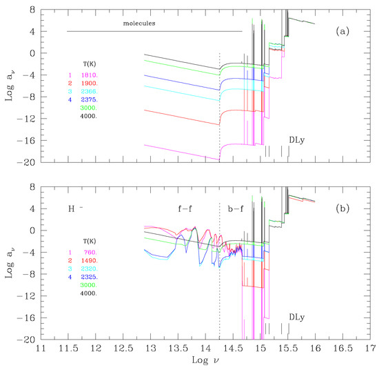 Frequency profile of the absorption coefficient at different temperatures, specified by color according to the key shown. Panel (a) without molecules, panel (b) with molecules. The absorption coefficients have been computed from the models (a,c) shown in Figure 2. The numbers on the left of the temperatures correspond to the positions marked in panels (a,c) of Figure 2.