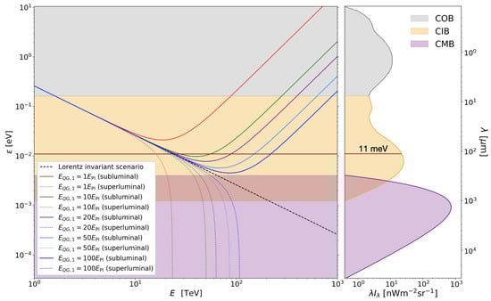 - Martínez-Huerta, H.; Pérez-Lorenzana, A. Restrictions from Lorentz invariance violation on cosmic ray propagation. Phys. Rev. D 2017, 95, 063001. [Google Scholar] [CrossRef]