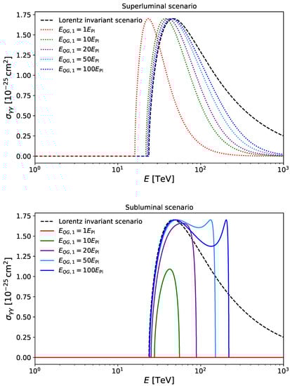 - Abdalla, H.; Böttcher, M. Lorentz Invariance Violation Effects on Gamma–Gamma Absorption and Compton Scattering. Astrophys. J. 2018, 865, 159. [Google Scholar] [CrossRef]