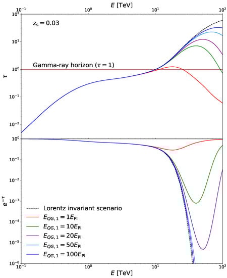 - Tavecchio, F.; Bonnoli, G. On the detectability of Lorentz invariance violation through anomalies in the multi-TeV γ-ray spectra of blazars. Astron. Astrophys. 2016, 585, A25. [Google Scholar] [CrossRef]