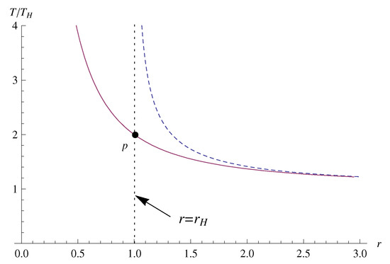 Note that is replaced with r in Equation (31). As , the freely falling temperature is reduced to the Hawking temperature (4). Note also that at the event horizon the freely falling temperature (32) is finite, while the fiducial temperature (5) diverges [29,30].