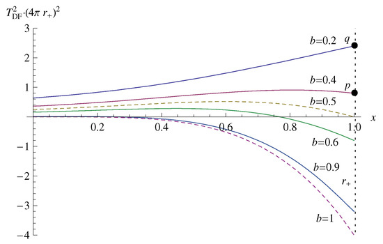 Thus, as seen in Figure 2, when , squared freely falling temperatures are finitely well-defined in the whole range of x. On the other hand, when , there is a region with no thermal radiation surrounding the horizon, where becomes imaginary. These are exactly the same with the ones in the BT’s work [29]. However, as stated before, the freely falling temperatures in the PG coordinates are defined beyond the horizon, while they are not in the original RN spacetime coordinates. To understand this situation better, we have drawn freely falling temperatures in the unit of the Hawking temperature in a drip frame in Figure 3. Then, one can see that the freely falling temperatures in a drip frame, which are obtained from the PG spacetimes, are increased, reached at a peak, and then decreased to zero as the observers fall into the singularity after passing through the horizon. Note that if they are obtained from the original RN coordinates having the spherical symmetric spacetime (79), freely falling temperatures are ended at finite values, such as p and q, at the horizon in Figure 2 and Figure 3. Finally, in Figure 3, the regions of no thermal radiation are in between the singularity and the positions where the freely falling temperatures vanish.