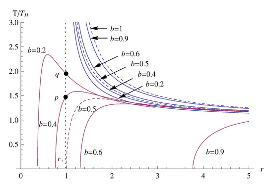 Here, the event horizon of () corresponds to and the parameter b lies between . Note that at the horizon (), this is reduced to