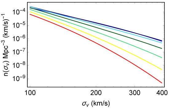 Co-moving number density of galaxies as a function of the velocity dispersion for different redshifts. The color code is: from black to red. The figure is obtained from fits to the Illustris simulation of [59].