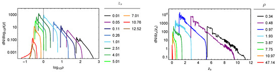 In Figure 3, we plot the (normalized) lensing probability density as a function of the magnification for different redshifts. On the left hand panel, we present curves for fixed-source redshifts, while in the right hand panel, we fix the observer distance . Note that the probability distribution is always strongly peaked at . We stress that both optical depth and probability density only depend on the lens model and on the model for the distribution of lenses, but they are observatory-independent and they do not depend on the distribution of sources. Similar results have been obtained in the past, as can be seen in [38,54,55,64] and are in good quantitative agreement with our findings.