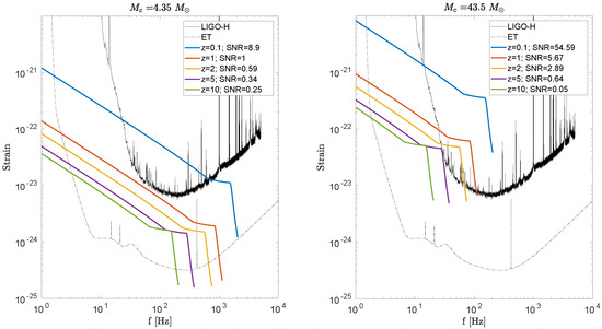 We fix in each panel a value of the chirp mass and we plot the strain for sources with that mass and in different redshift bins. The solid black curve is the O2 strain sensitivity of the LIGO-Hanford detector [67], and the dashed–dotted curve is the strain sensitivity of the Einstein Telescope [69].