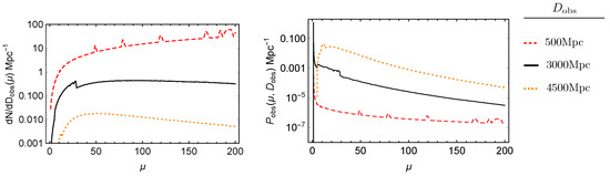 (Left) Number of events per unit of Mpc visible if the magnification is as a function of , for different observed luminosity distances: Mpc, indicated by red, black and orange curves, respectively. This quantity is given by in Equation (19). (Right) The same quantity is multiplied by to obtain the probability distribution of magnification in Equation (21) per unit of observed distance. The little peaks in the red line come from the fact that when fixing , we pick up contributions from different , as can be seen in Figure 4. These are numerical artifacts from our binning of .