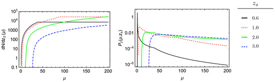 In Figure 7, we plot the same quantities for different values of the cosmological redshift of the source. At a low redshift, tends towards a constant at high magnification since we see all events (black curve, left panel). The product nearly tends towards a constant at high redshift which indicates that grows similarly to at high redshift (blue dashed curve, right panel).
