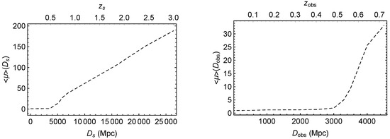 In Figure 8, we present the results for the average amplification factor as a function of the cosmological redshift and luminosity distance of the sources (left panel) and as a function of observed redshift and luminosity distance of the sources (right panel). No sources are observable beyond 5500 Mpc. (This can be understood by computing the probability of seeing a source from a given observed distance, i.e., integrating over . The probability of seeing an object from a distance bigger than 5000 Mpc is smaller than .) The minimum amplification needed to detect sources from a redshift and with a given is given by