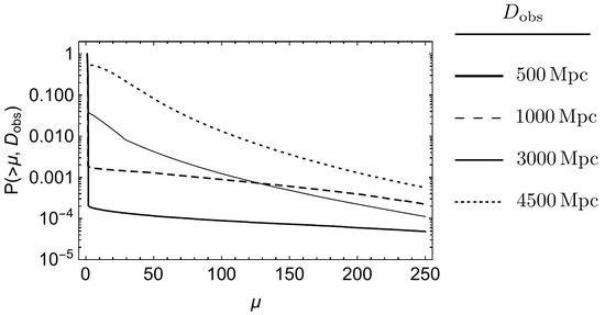 which of course depends on the threshold , i.e., on the detector sensitivity. In full analogy with Equation (16), we introduce the probability distribution of magnification as a function of the observed luminosity distance of the source: