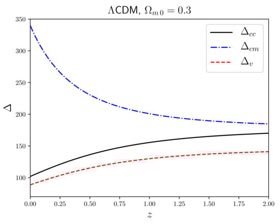 Redshift evolution of three virial overdensities definitions, Equations (42)–(44) for the CDM model with . In this plot, is determined using the method summarized by Equation (78), while and are determined by the proper numerical method discussed in Section 6.1.