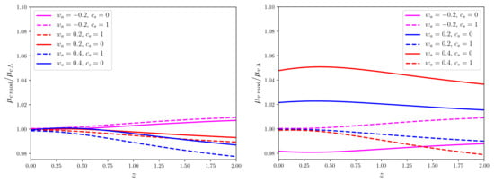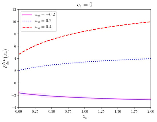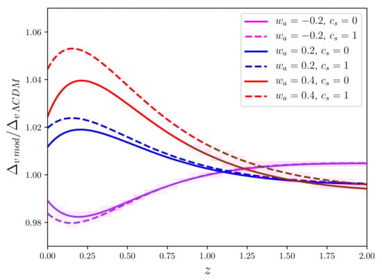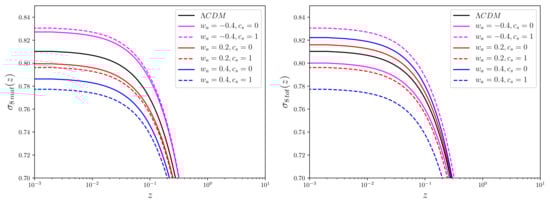 As can be seen, the magnitude of DE perturbations is determined by both w and . If , as it should be at low-z, DE perturbations are strongly suppressed regardless of . For DE models in which w deviates from at higher redshift and with low or negligible , DE perturbations can be as large as matter perturbations in the matter-dominated era, as indicated by (14). As we will see, in this case, DE fluctuations can become nonlinear and impact structure formation.