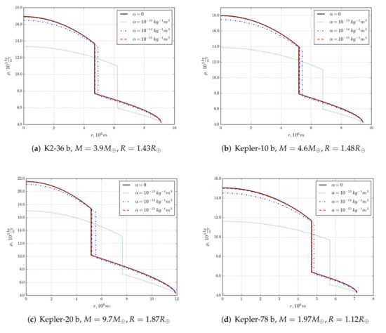 - Density profiles, as already noticed in our previous works, can significantly differ in modified gravity with respect to the Newtonian model. We observe not only lower values of central density and on the core–mantle boundary, but also the cores of the given exoplanets are bigger; that is, the cores are less dense in the case of Palatini gravity. Therefore, the observed transiting planets can have different structure for the same masses and radii than the one predicted in the usual way, and can affect the planet’s polar moment of inertia. The fact that internal structure of planets is affected by modifications of gravitational interaction is to be expected, since Equations (3) and (4), allowing one to compute the density profiles, change. This entails the fact that modifications of gravity introduce additional degeneracy when trying to determine planets’ internal composition by looking at the mass–radius relationship [23]. The values of internal pressure and core radius, giving the same total mass and radius, depend on the parameter . Therefore, this fact alone does not allow us to constrain alternative gravity models. What actually could help in distinguishing between different models would be collecting seismic data from Solar System planets, and investigating their density profiles. For example, Earth’s mass and radius are well known, as well as its internal composition, so, after having developed a more realistic model taking into account modifications of gravity, it will be possible to place a stringent constraint on values of .